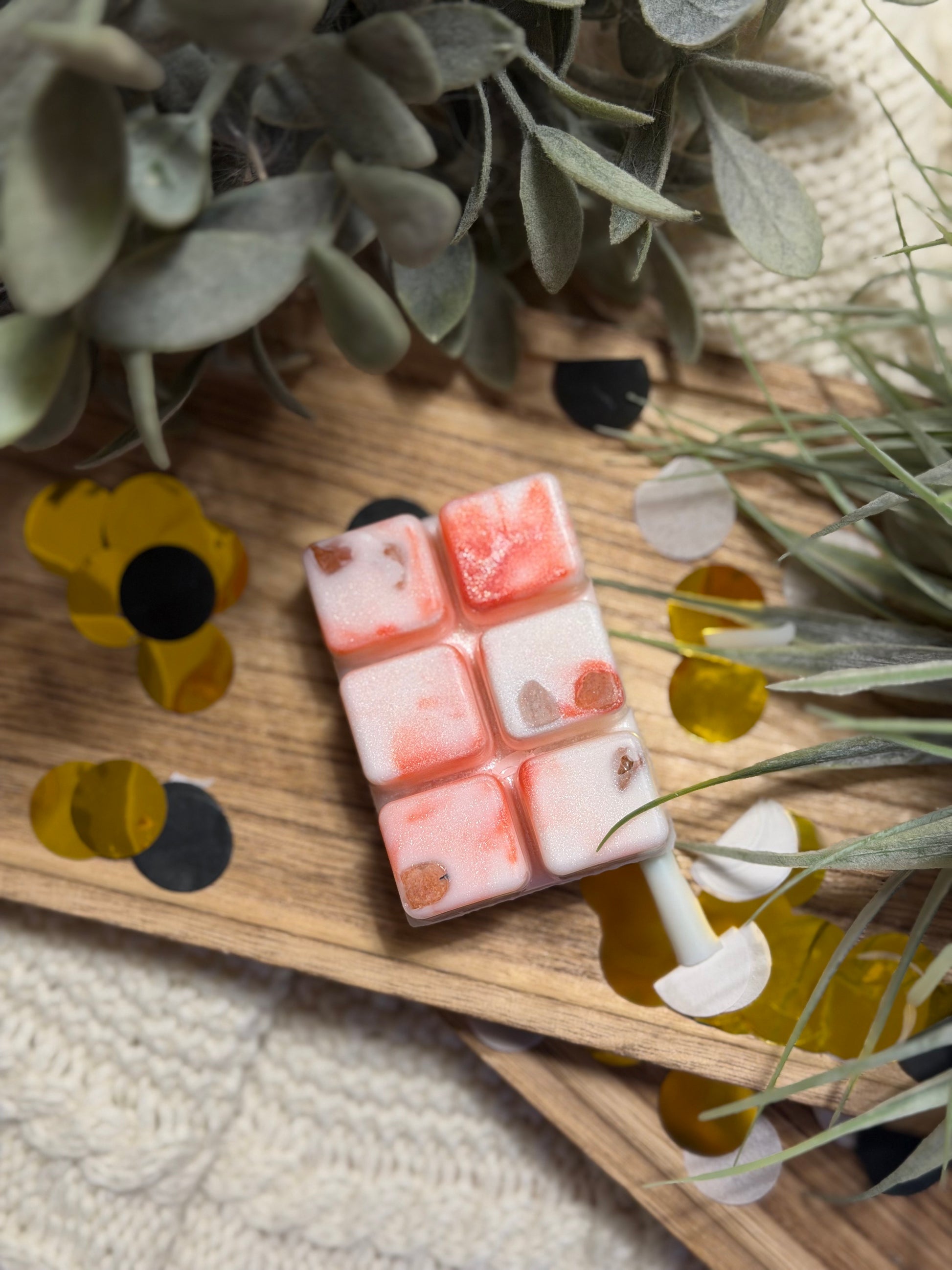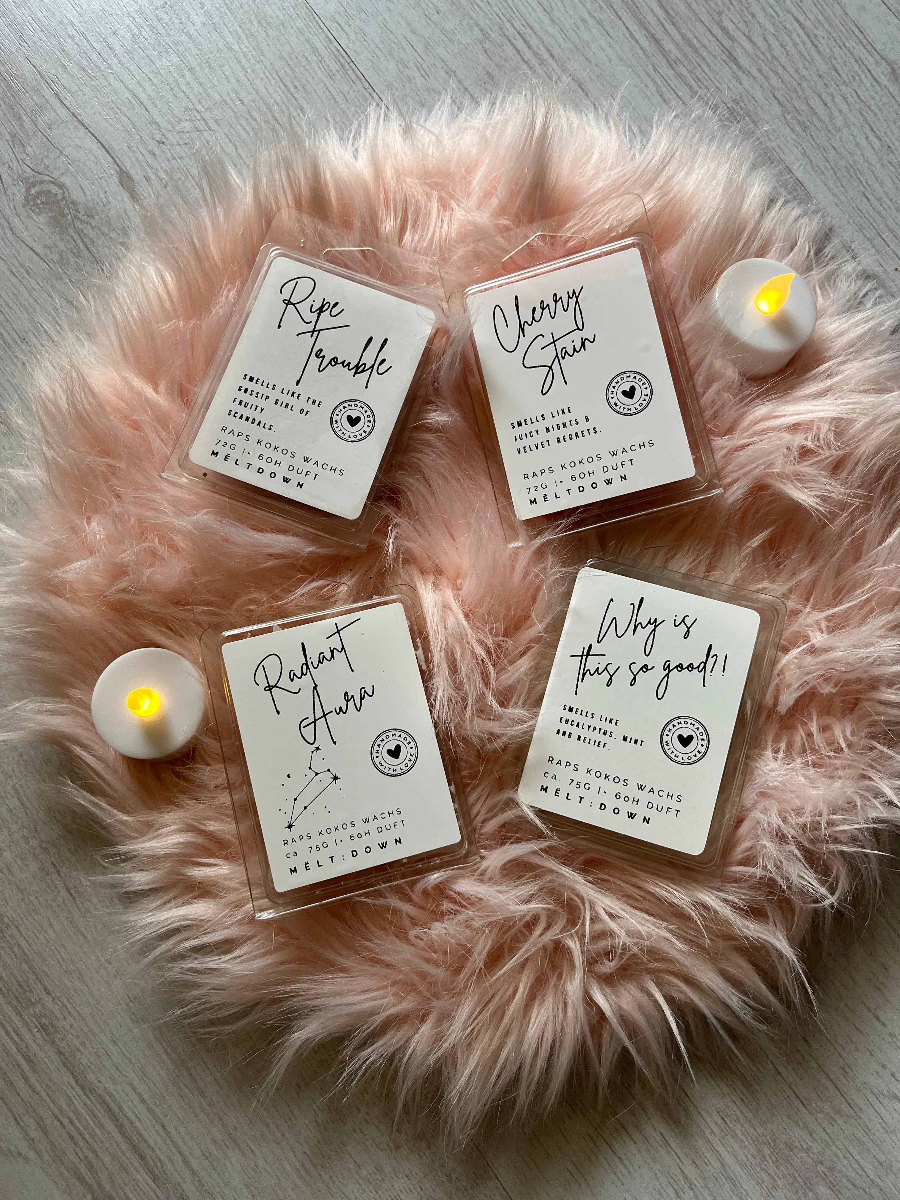 Unsere Melts bestehen aus einer nachhaltigen Mischung aus Raps- und Kokosöl – ganz ohne Palmöl, Soja, Gentechnik oder Zusatzstoffe. Das Ergebnis: vegan, clean und sicher – mit hervorragender Duftverteilung und gleichmäßigem Schmelzverhalten.